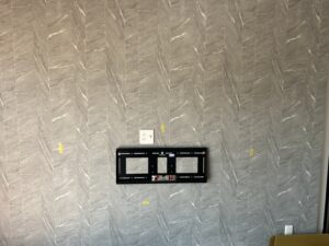 Before写真1枚目では、テレビ設置予定箇所のふかし壁全体をご確認いただけます。見た目は通常の壁と変わりませんが、内部に下地が入っていることが重要なポイントです。 Before写真2枚目では、HAMILeX(ハミレックス)製の壁掛け金具を、ふかし壁の下地位置に合わせて取り付けた状態を掲載しています。耐久性と安全性を考慮し、メーカー仕様に沿って丁寧に固定しました。
